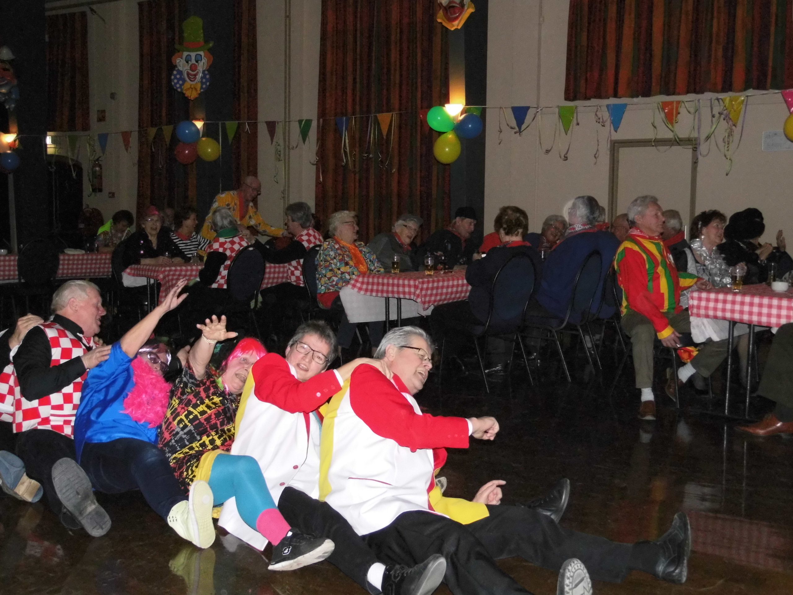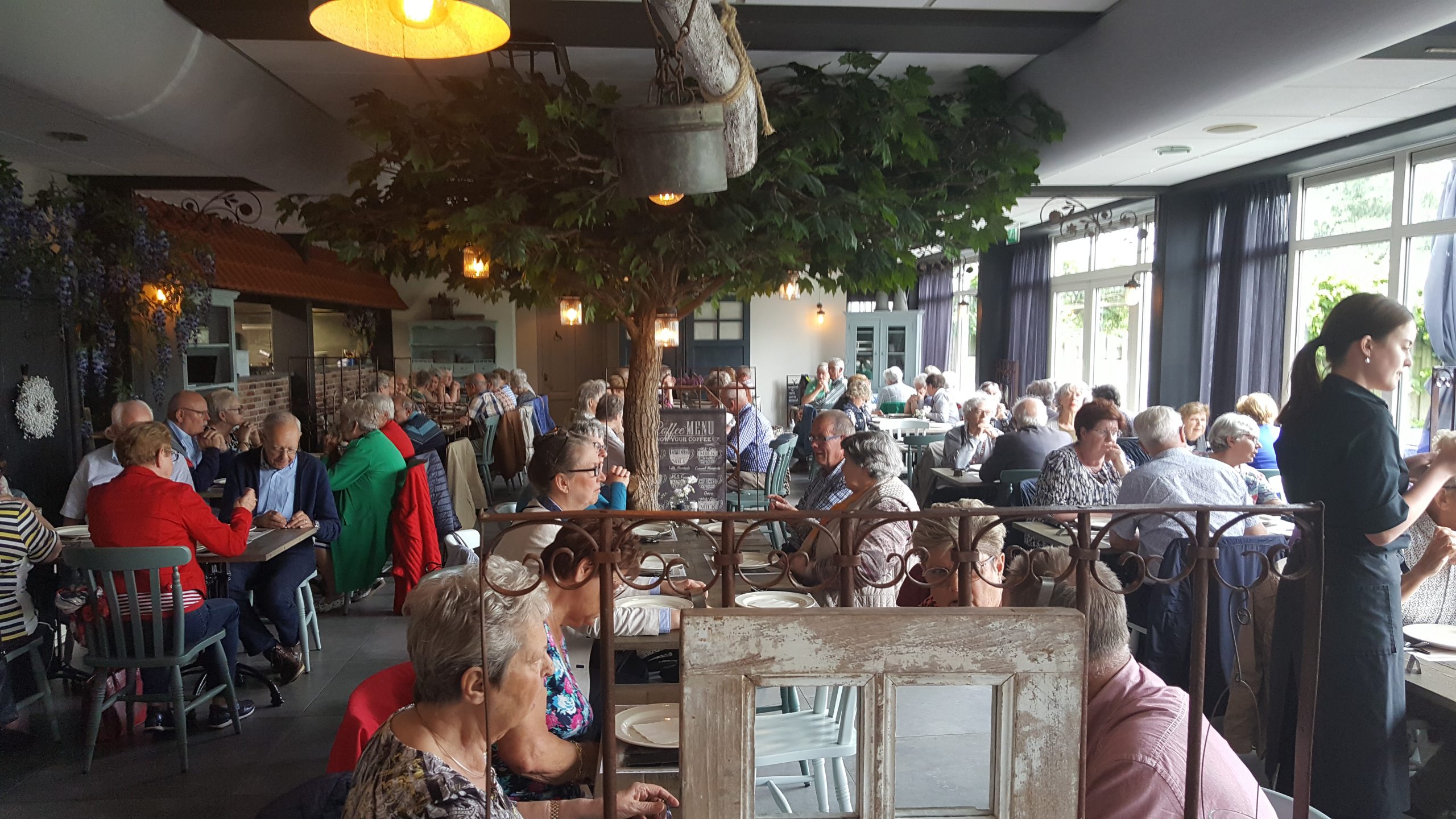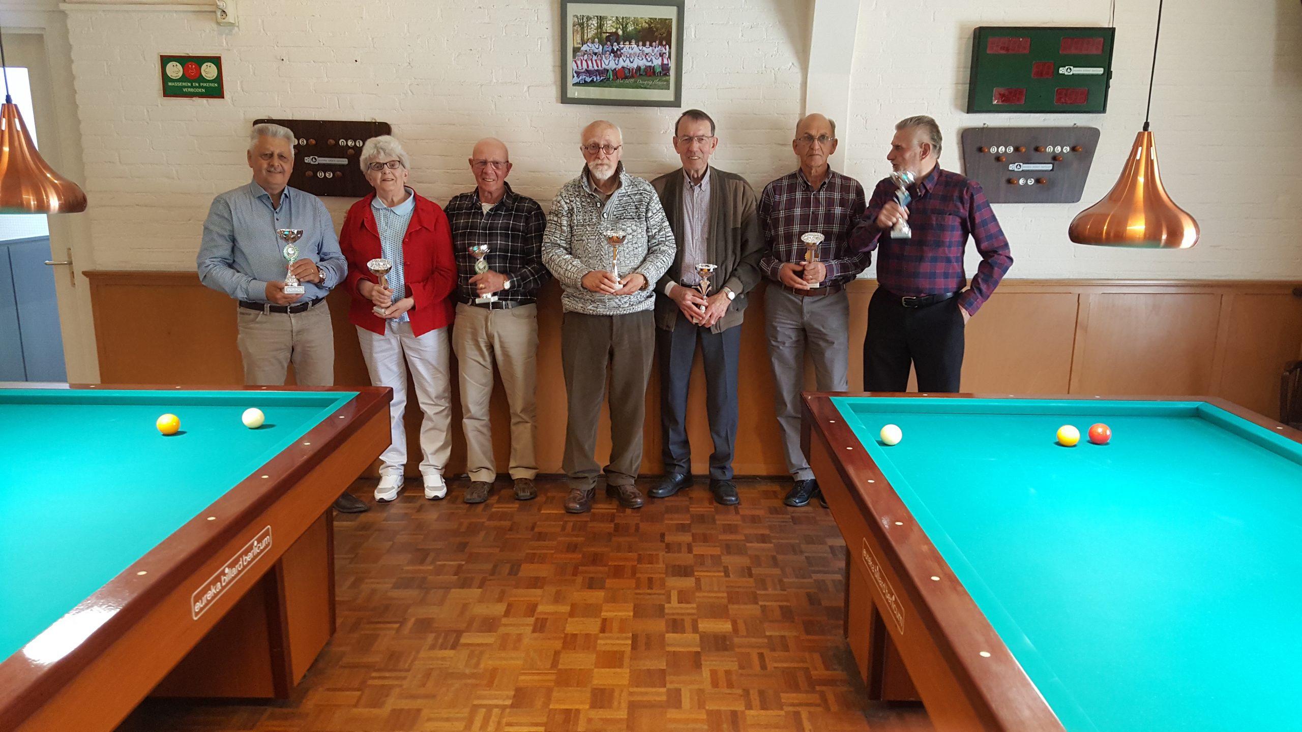 Prijsuitreiking van de biljartcompetitie 2019. De winnaars van links naar rechts: Sam Kampert, Mia Nooijen, Wim Nooijen, Tiny Smits, Ger Vlemmings, Martien v.d. Heijden en Tijn Schellekens.