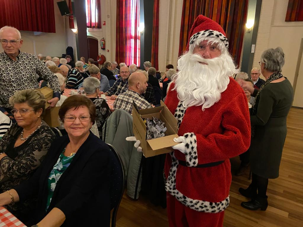 De kerstman deelt cadeautjes uit tijdens kerstviering 2019