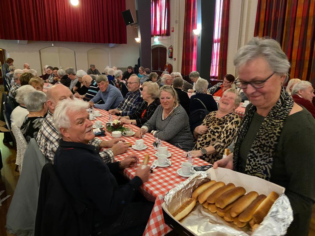 Worstenbroodjes uitdelen tijdens kerstviering 2019 in De Vink